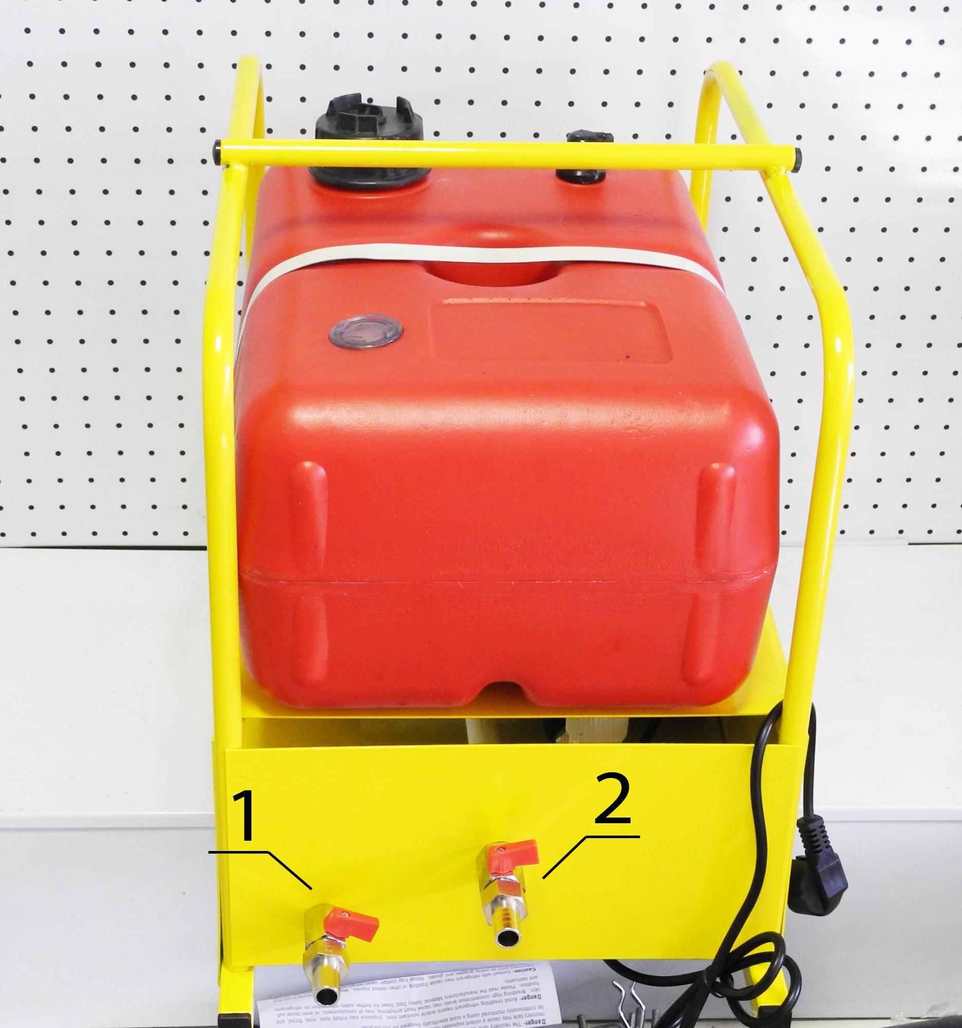 Для проведения «обратной» промывки произведите слив находящегося в промываемой системе R141b в бак установки. Для этого сделайте следующее: выключите установку, перекройте вентиль «2» и вентиль на конце шланга присоединённого к этому вентилю, ослабьте хомут на штуцере вентиля «2», во избежание слива из шланга R141b, пережмите шланг как можно ближе к вентилю «2» и снимите шланг со штуцера вентиля «2». Затем откройте горловину бака, вставьте в горловину свободный конец шланга, откройте вентиль на шланге и ненадолго включите установку – находящийся в промываемой системе R141b сольётся в бак установки.